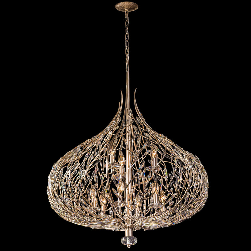 Bask is a unique crystal piece that melds together fashion-influenced shapes and nature inspired details. Its pre-installed premium crystals and gold dust finish give duality with silvery sparkles and glimmering gold. This glamorous and whimsical collection is hand-made using recycled steel and features unique elements, starting at the hand-hammered canopy.