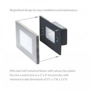 - Fits into a 2" x 4" Junction box with minimum inside dimensions of 3"L x 2"W x 2.5"D