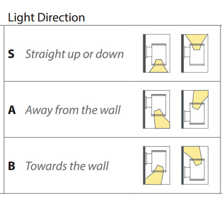 - Light Direction: Straight up or down, Away from the wall, Towards the wall
