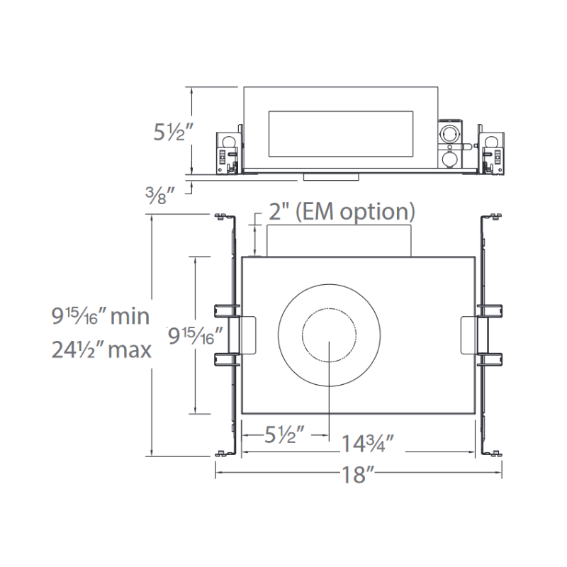 - EM fixtures provided with integral emergency battery back up with 24" lead wire remote test switch