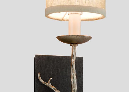 Troy LightingTroy Adirondack 1-lt Wall Sconce Features Finish: Graphite and Silver Leaf Metalwork: Hand-Forged Iron Shades: Hardback Linen Voltage: 120V Dimen...