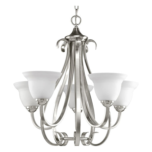 Progress LightingElegantly formed five-light chandelier featuring soft tea-stained, bell-shaped glass. Features: Finish/Glass: Brushed Nickel/Etched White, Forged ...