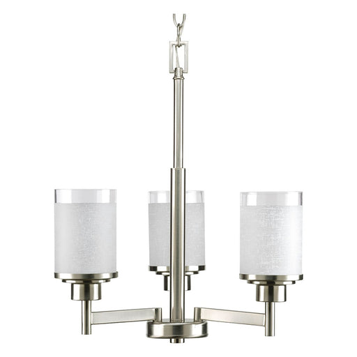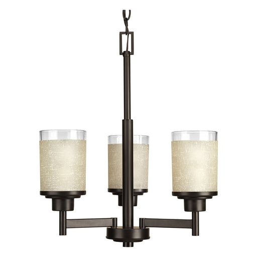 Progress LightingAlexa 3-lt ChandelierFeatures: Finish/Glass: Brushed Nickel/Etched Linen with clear edge glass, Antique Bronze/Etched Umber Linen glass Steel const...