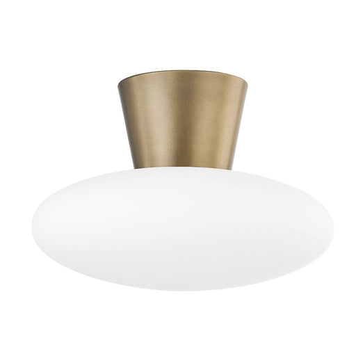 Troy LightingThis modern flush mount features a longer, tapered collar in Patina Brass and a smooth, elongated opal etched glass shade. Larger in scale than ...