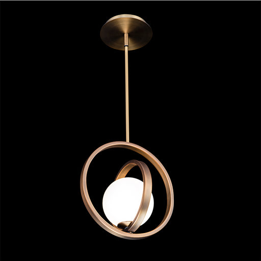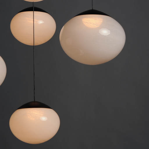 DWELEDSatalite delivers an otherworldly glow from etched opal globes orbiting a central axis. Wrapped in bands of metal and dramatic in scale, the pendan...