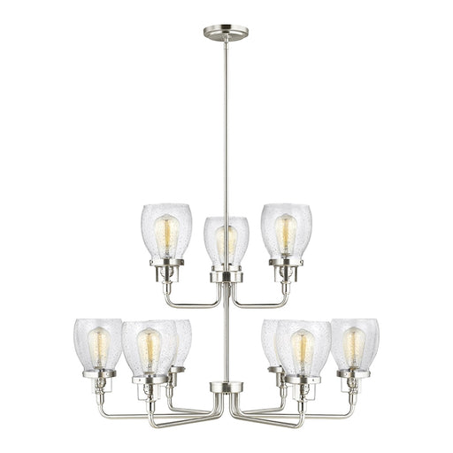 Generation LightingGeneration 3214509 Belton 9-lt 32” Light Up Chandelier Features Finish: Brushed Nickel Material: Steel, Clear Seeded Glass Voltage: 120V Sloped ce...