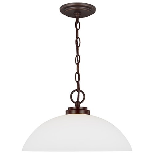 Generation LightingGeneration 6139801EN3 Norwood 1-lt 6” LED Pendant Features Finish: Bronze Material: Steel, Clear Highlighted Satin Etched Glass Wattage: 9.3W Volt...