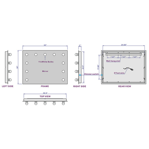 Paris MirrorFeatures Illuminated Size: 32 x 24 Shape: Rectangle Wattage: 33W Voltage: 110V Color Temperature: 3000K, 6000K Lumes: 2970, 3520 CRI: 90+ Dimma...