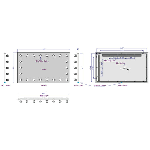 Paris MirrorFeatures Illuminated Size: 48 x 28 Shape: Rectangle Wattage: 66W Voltage: 110V Color Temperature: 3000K, 6000K Lumes: 5940, 7040 CRI: 90+ Dimma...
