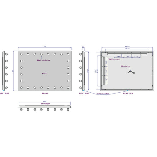 Paris MirrorFeatures Illuminated Size: 48 x 36 Shape: Rectangle Wattage: 72W Voltage: 110V Color Temperature: 3000K, 6000K Lumes: 6480, 7680 CRI: 90+ Dimma...