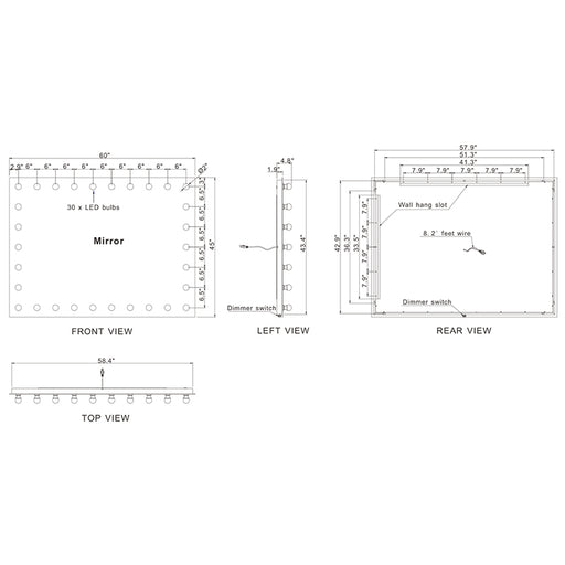 Paris MirrorFeatures Illuminated Size: 60 x 45 Shape: Rectangle Wattage: 90W Voltage: 110V Color Temperature: 3000K, 6000K Lumes: 8100, 9600 CRI: 90+ Dimma...