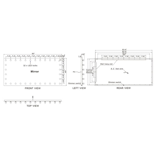 Paris MirrorFeatures Illuminated Size: 85 x 40 Shape: Rectangle Wattage: 96W Voltage: 110V Color Temperature: 3000K, 6000K Lumes: 8640, 10240 CRI: 90+ Dimm...