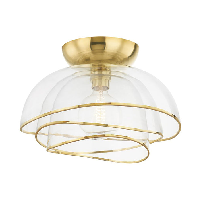 A trio of clear glass shades with undulating edges are nested within each other creating graceful lines and a beautiful sense of movement. The Vintage Polished Brass edging feels ribbon-like and adds to the peaceful asthetic and fluidity of this flowing flush mount.