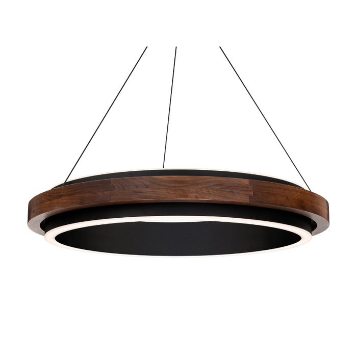 Crafted from rich walnut wood whose grain adds texture and character, the organic modern Delaney pendant light features a beautifully rounded frame that encircles a sleek LED diffuser, offering soft, even 3000K illumination