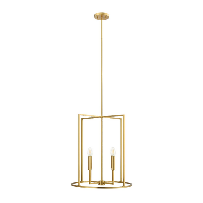 This tall, cylindrical 4-light chandelier has an airy structure that expertly combines sharp and round angles and is finished in Natural Brass.
