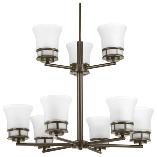Progress LightingNine-light, two-tier chandelier with smooth forms and windowpane style gallery that produce a beautiful, modern gas light effect. Overscaled tubing...