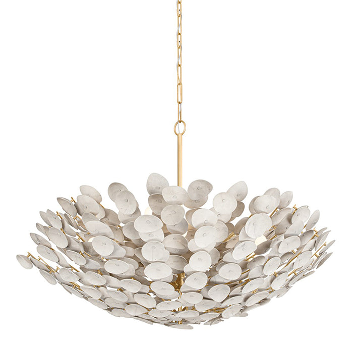 Delicate discs of white-washed coco shells surround a Vintage Gold Leaf frame creating a form that feels both organic and high end. Add a soothing, luxe look to any ceiling with this modern semi-flush and chandelier.