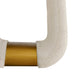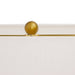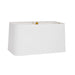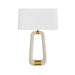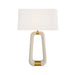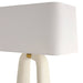 A modern form in ivory ricestone composite is accented with antique brass-plated steel, which visually unites the mixed-material foundation adding a mix of sculpture and textural touch to a space, it is topped with a rectangular white linen drum shade with white cotton lining. Finish will vary.