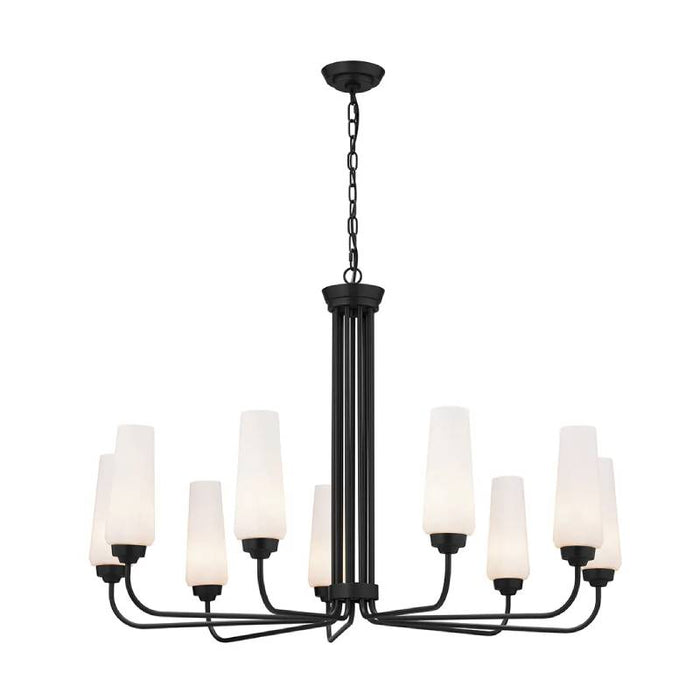 The Truby 9 light chandelier illuminates through aerodynamic-inspired arms made of Satin Etched Cased Opal Glass.