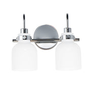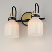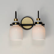 Celebrate nostalgia using these sconces that feature opal White glass shades in a bell shape. Supported on rings of metal in your choice of Polished Chrome or a bolder two-tone Black and Satin Brass, this refreshing take plays into a retro aesthetic of your bathroom decor.