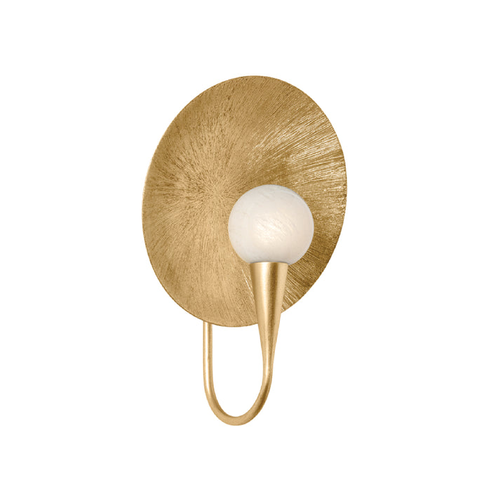 Ahmad is an artful gem for small spaces. This beautiful oyster and pearl-inspired sconce blends masterful craftsmanship with a delicate materiality. Supported by a thin J-arm, the cloud glass sphere has the appearance of floating in front of a Vintage Gold Leaf dish. The glass highlights the radial pattern on the dish, which in turn acts as a reflector for the light.