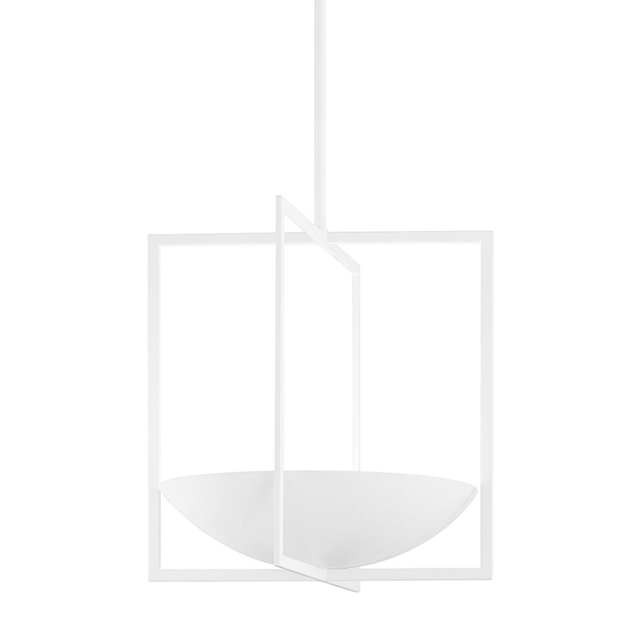 Based on simple geometric shapes, Loki gives new life to the classic cage pendant. A bowl shade rests within two interlocking rectangles that seem to suspend in midair. Light fills the bowl, flows through the open frame and reflects beautifully off the White Gesso finish. This clean, sculptural pendant fills any space with light and style.