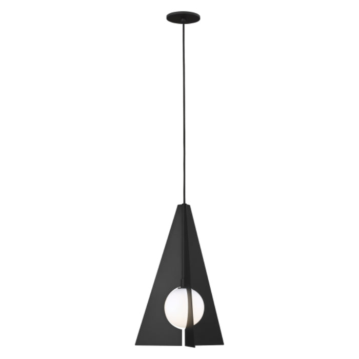 The Orbel Collection by Sean Lavin for Tech Lighting is inspired by Mid-Century modern art with contrasting geometric shapes. The Orbel Pyramid Pendant features metal triangles that encompass a frosted sphere of light.