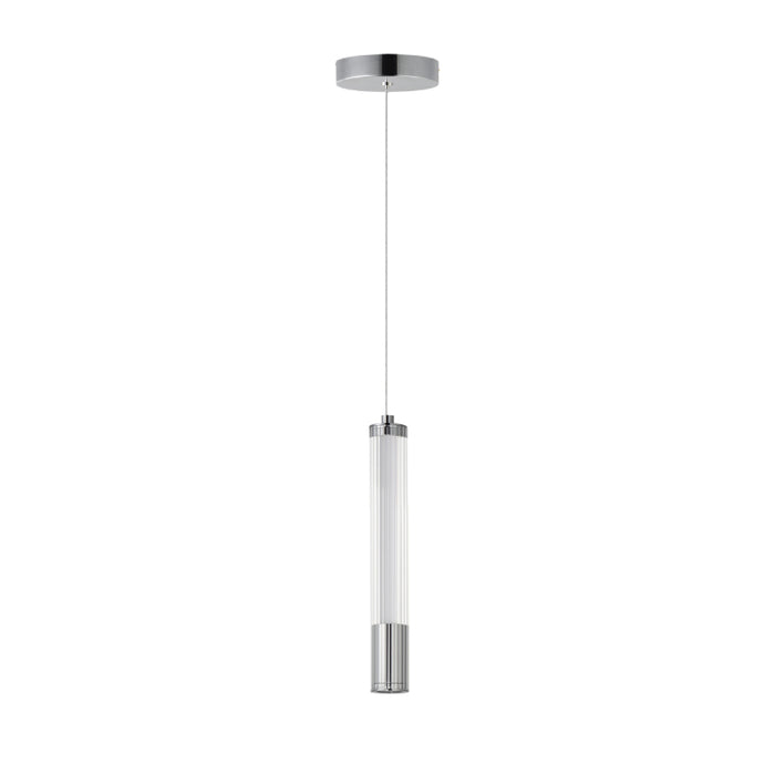 A central, cylinder diffuser of opal white acrylic diffuses LED lighting within a cavity of thin ribbed glass of various lengths. Both imaginative and functional, the bright pendants encase an additional down light recessed within a Polished Chrome, Naturally Aged Brass or Matte Black housing casting light downward.