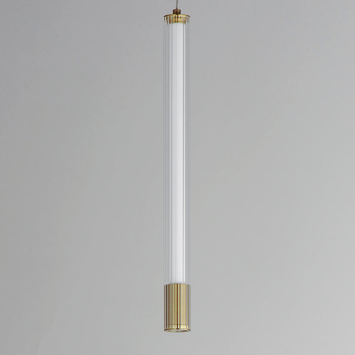 A central, cylinder diffuser of opal white acrylic diffuses LED lighting within a cavity of thin ribbed glass of various lengths.