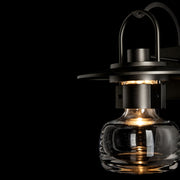 Our steampunk version of a traditional lantern is bold and striking. Our large Mason Outdoor Sconce shows plenty of craftsmanship, from the thick blown glass bell to the metallic curves of support arm and handle, to the details of the riveted collar-this has it all.