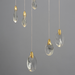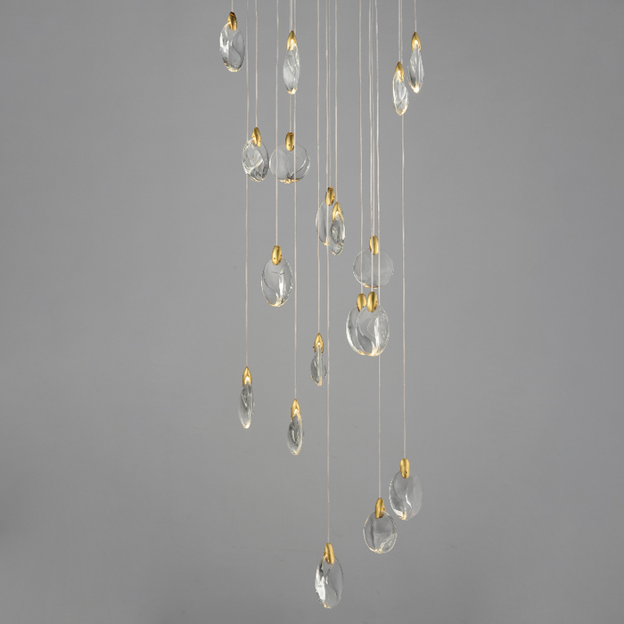 As if naturally formed from the ebbing shores of a riverbed, smooth and irregularly shaped crystal pebbles are suspended by cast metal clasps in a Polished Gold finish. Discreetly illuminated by concealed LED light sources within the clasps, additional downlight originates from LED GU10 lamps housed in a Matte Black canopy adding to the refracting iridescent shimmer on the crystal surface below.