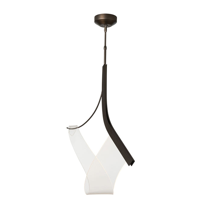 Fluid and ethereal, the Sling Pendant gives new meaning to "form and function", An elegantly swooping form makes light itself into a sculptural element. Held by steel handforged by Vermont metalcrafters, the Sling Pendant adds beauty to its space.