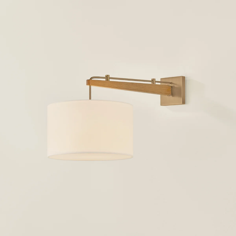 Inspired by vintage furniture, the Mailo family’s complex woodworking techniques and exposed hardware elements put its construction at the center of the design. The white oak frame of each piece is complemented by Patina Brass accents and a matching cord that runs parallel to the arm. In its 1-light sconce format, Mailo swings from the backplate, making it an ideal bedside light that can be easily adjusted. The white linen shades add a finishing note of freshness to this modern family.