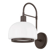 A dome-shaped opal glossy glass shade is suspended from a curved arm and detailed with Patina Brass or Bronze accents on both the top and bottom. The sleek silhouette and knurled detailing add a timeless appeal to this fresh and elevated modern wall sconce.