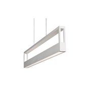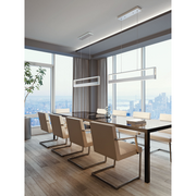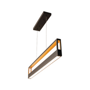 Decorative linear metal pendant is suspended with an 9 foot adjustable cable. Product can be used over receptions desks, restaurants, and in public spaces.