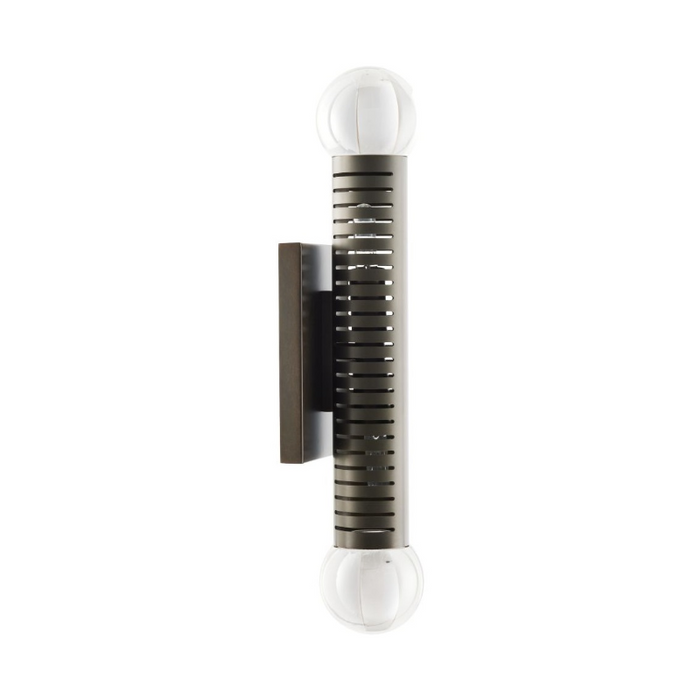 Our English bronze-plated steel sconce with a pair of smoke crystal ball has a handsome machined look that is even more eye-catching when paired or tripled. Its balance of linear and round elements lends an architectural presence to a hallway or corridor, while slotted perforations allow for an enchanting bleed of light. Damp-rated, although limited covered outdoor areas may affect finish.