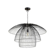 Illuminate your ensemble in eclectic style with the one-light Canopy pendant. This matte-black pendant is crafted from iron, featuring a three-tier open-frame shade that liberally diffuses light emitted from a single 60W medium based bulb. The design allows for the emission of an abundance of ambient light in every direction while offering a whimsical look fit for any modern, transitional, or boho-inspired space.