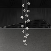 Like a tornado whirling in space, multiple curves of illumination are backed by a black frame and suspended from a cloud-like canopy. Integrated LEDs provide crisp, clean light to modern spaces.
