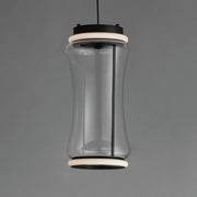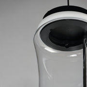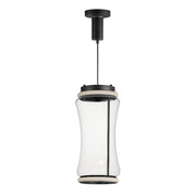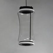 Segmented by bright LED rings finished in Matte Black, glass shades of an hourglass shape are combined into various configurations. The hand-blown glass is entirely transparent and varies in size creating an undulating pattern.