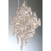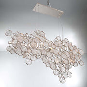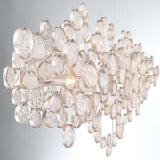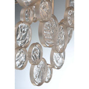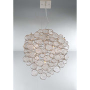 Intricate champagne silver metal wire frame adorned by delicately hand strung glass wafers.