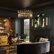 A compelling design that captivates from any angle, the Revel family gleams with sophistication. Luxurious crystal rods are honed into unexpected asymmetrical formations to produce an organic elegance that is both raw and refined. Revel's linear and circular chandeliers are available in both Burnished Gold and rich Black finish options.