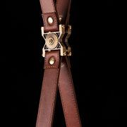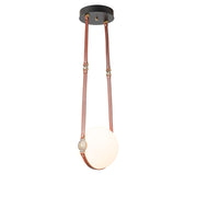 Hung singly over a night table, or in multiples over a kitchen island or bar, the Derby Small Pendant is as intriguing as it is simple. Handcrafted leather straps from a local New England artisan, featuring beautiful brass fasteners and buckles, suspend a single 10" glass sphere encasing an LED lighting element..
