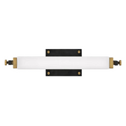 Rollins is both industrial in form and transitional in style. Unique rectangular etched opal glass has softly rounded edges that is offset by contrasting details on the backplate and the knobs anchoring either end. This integrated LED design comes in two finish combinations, Black with Chrome, and Black with Heritage Brass, and can be hung both vertically and horizontally.