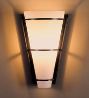 The glass is the focus of our Cone Sconce. Three strips of hand-shaped steel clasp the cone. With the combination of the V-shape of glass and mounting plate and the three bands, the shape of cast light looks fantastic.