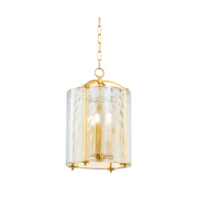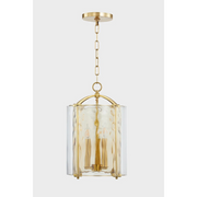 Resembling the fluidity of flowing water, this dynamic pendant light features either a light champagne or clear water glass shade. As the unique glass surface gently obscures and filters light, it glows brilliantly from within. The Aged Brass framework and chain create a warm finishing touch.