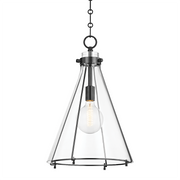 Eldridge is a minimalist cage pendant with maximum style. Light pours through the glass shade and allows the lamp socket within to shine. Available in a conical and a dome shape with Aged Brass, Old Bronze or Polished Nickel finishes, these pendants suspend from gorgeously detailed hook and loop chains.
