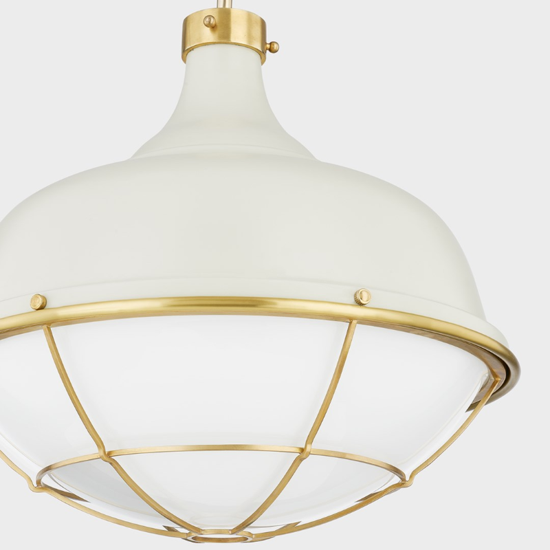 Gorgeous Aged Brass cagework and glossy opal glass give this recognizable silhouette an instant upgrade. The refined hardware and Off-White, Distressed Bronze, and Darkest Blue finish options add to Holkham's elevated nautical aesthetic. Part of our Mark D. Sikes collection.
