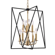 Laszlo makes a stunning first impression. A polished, tightly-scaled candelabra resides at center. Contrasting it in a dizzying geometric frame are two overlapping triangles in textured black metal. Traditional lamping and avant-garde abstraction juxtapose in a fixture whose allure brings us into the now.