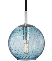 Thick mouth-blown glass with a discrete pattern of bubbles domes around a warm incandescent bulb. At its base, the globe has an opening, which allows you to manually change the bulb. Smooth woven cords add an urbane touch. Exciting options in our Rousseau family include several fun colors and the choice between hanging a single pendant or a staggered cluster.