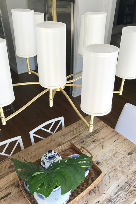 Modeled off the basic idea of the curved-arm chandelier, Dillon’s arms are gently undulating waves bearing candle sticks. Long, cylindrical silky shades add a sense of visual weight to Dillon’s slight frame. Restrained stepping unifies the airy transitional fixture. Wall sconce versions create an opportunity to match while making a fine addition to any space on their own.